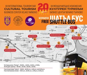 Специалният EXPO бус за участниците и посетителите на МТИ „Културен туризъм“ ще се придвижва по маршрут от Гранд хотел „Янтра“ до BCVT /Бизнес Център Велико Търново/ в дните 8, 9 и 10 октомври.