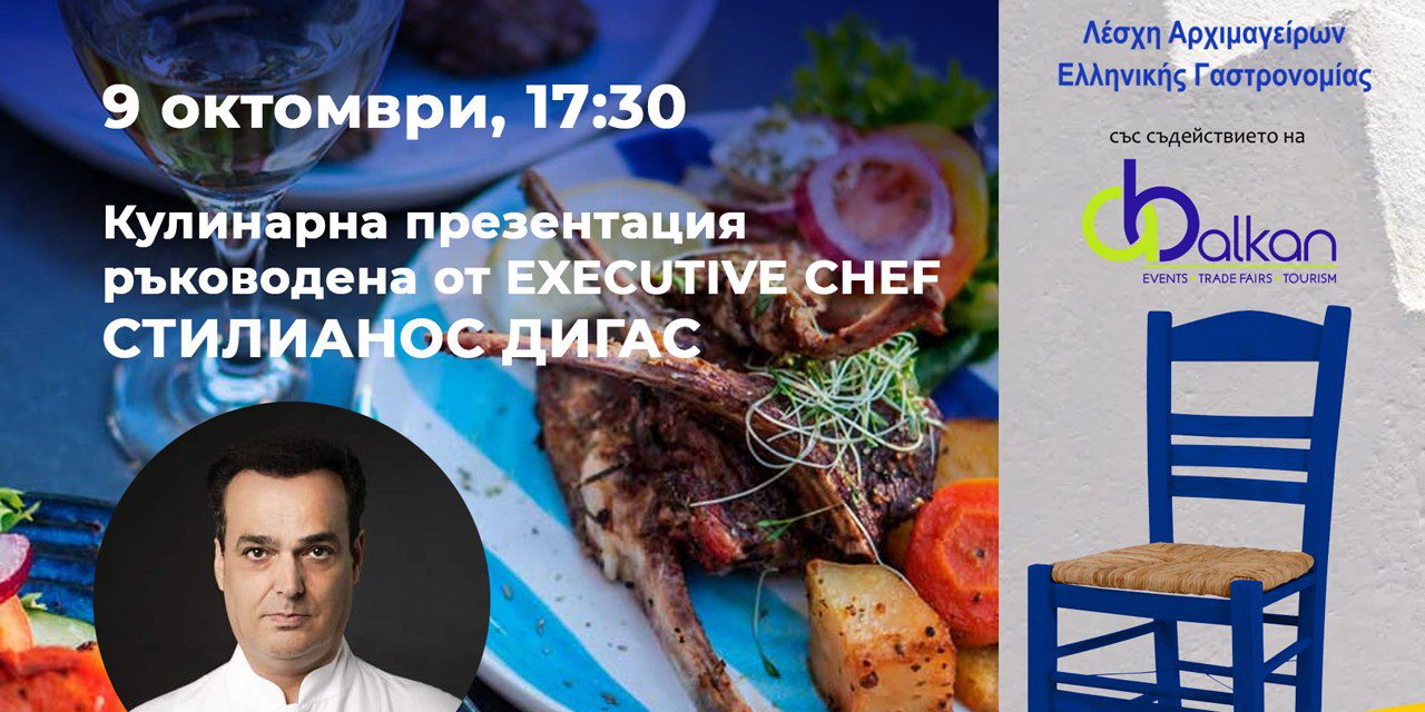 The culinary presentation organized by „A BALKAN“ Ltd. and the GUILD OF PROFESSIONAL COOKS OF GREEK GASTRONOMY will be led by EXECUTIVE CHEF STYLIANOS DIGAS – president of the Guild of Professional Cooks of Greek Gastronomy and deputy. Chairman of the Federation of Professional Chefs of Greece.
