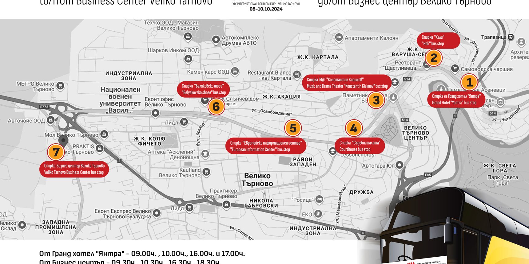 The special EXPO bus for the participants and visitors of the ITF "Cultural tourism" will have a route that starts from Grand Hotel "Yantra" to BCVT /Business Center Veliko Tarnovo/ on October 9-th and 10-th.